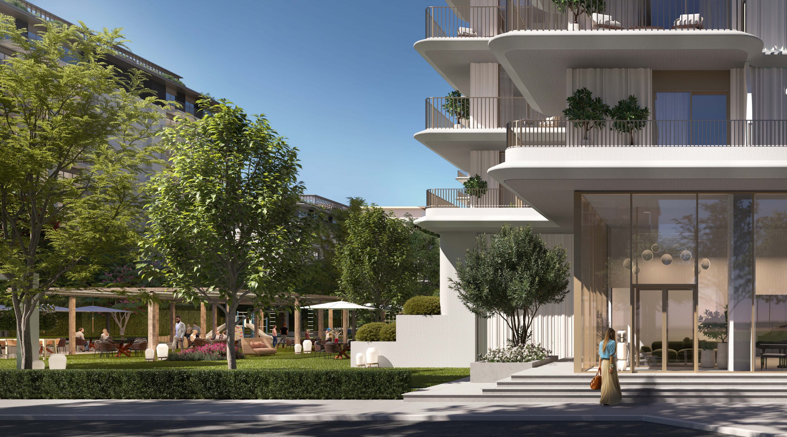 Design Concept: The architecture features sleek walls with curved edges, creating a sense of harmony. Expansive balconies and glass facades enhance the open, airy feel of the residences.